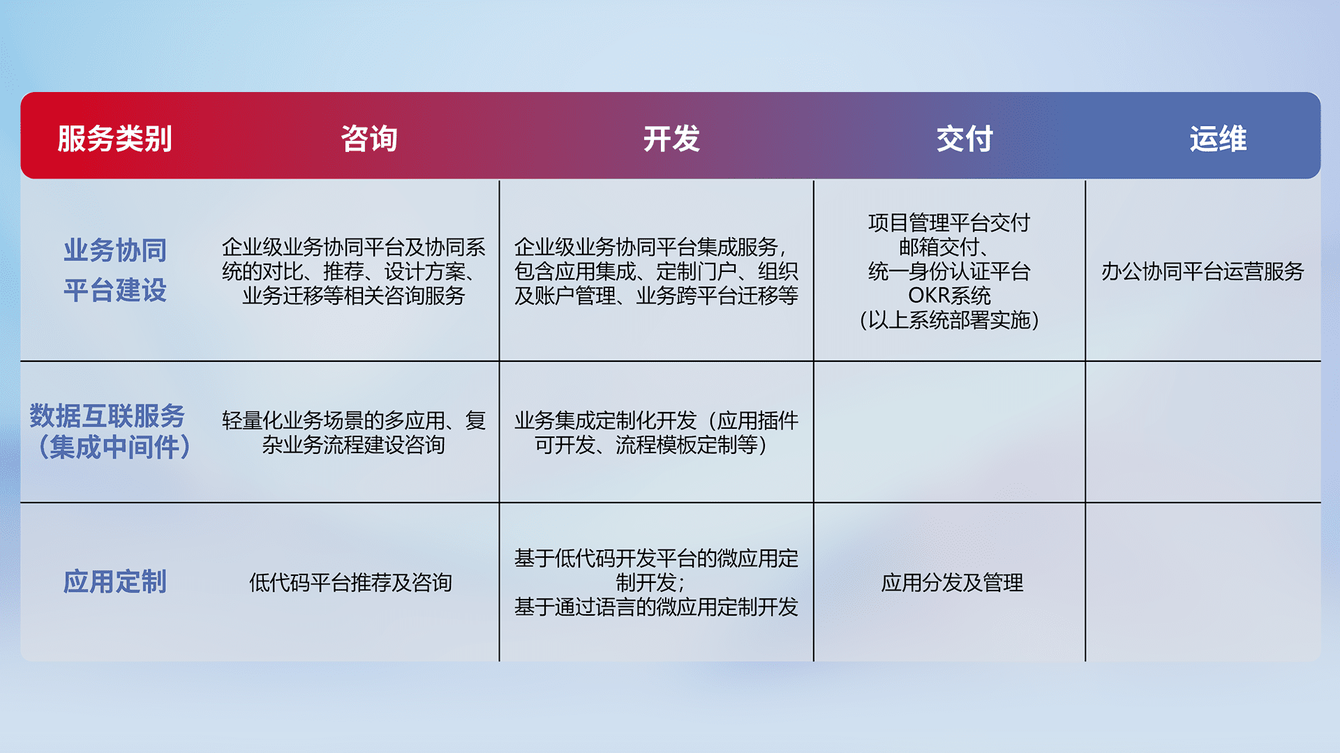针对钉钉、、企微、、、IDaas等平台级产品提供产品的规划、、、方案、、、交付、、、定制化开发等服务,,,实现如统一协同办公、、智能客户服务、、、、混合会议管理、、智能数据查询、、、、等业务场景,,,实现数字化转型。。。