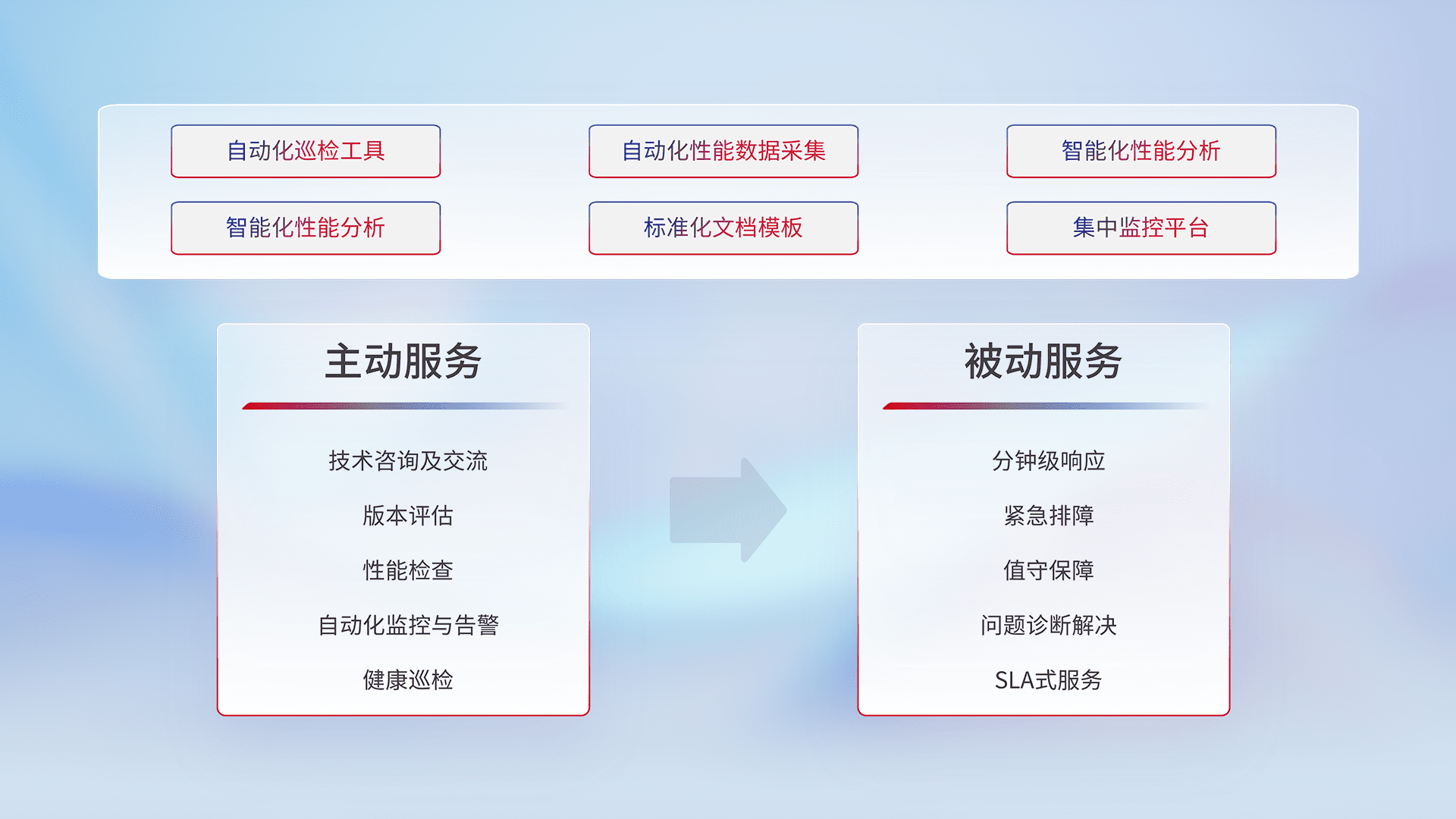 智能化工具和标准化文档,,,保障服务质量,,,提供主动服务(包含技术咨询、、、版本评估、、、性能检查、、、自动化监控与告警、、健康巡检)和被动服务包含(分钟级响应、、、、紧急排障、、、值守保障、、、、问题诊断解决、、、、SLA服务)。。